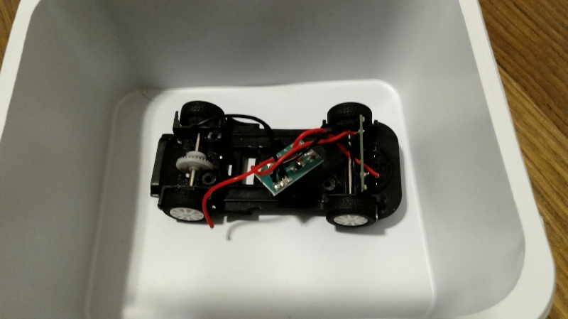Sain eilen juotettua uudet johdot paikoilleen moottorin ja piirilevyn välille, auto kulkee taas. Joku hämminki tinauksen yhteydessä tuli kun valot eivät enää tuossa korjatussa autossa toimi, pitänee tutkia asiaa joskus lisää. Piirilevyltä moottorille menevä musta johto oli selvästi litistynyt yhdeltä kohtaa, joten todennäköisesti se on ollut syynä moottorin puutteelliseen toimintaan.