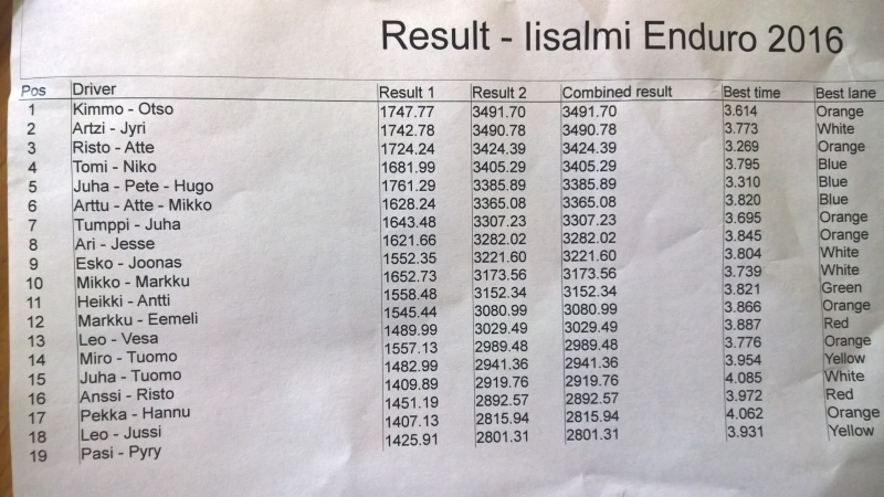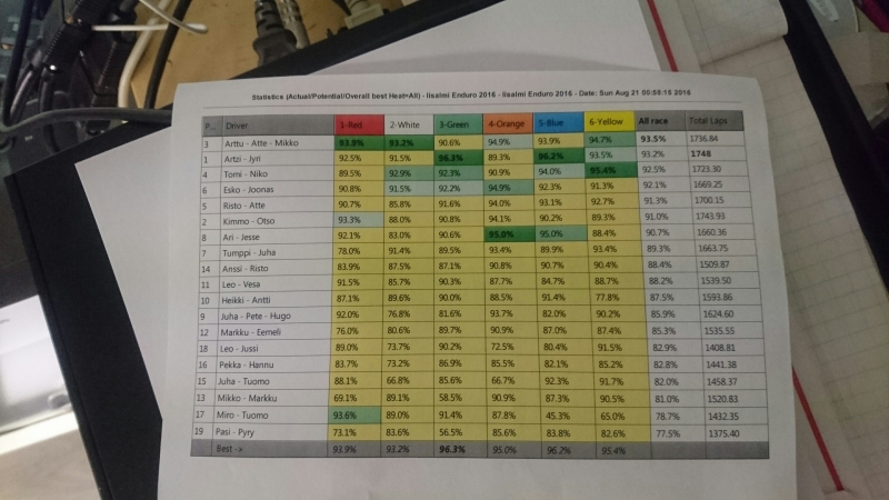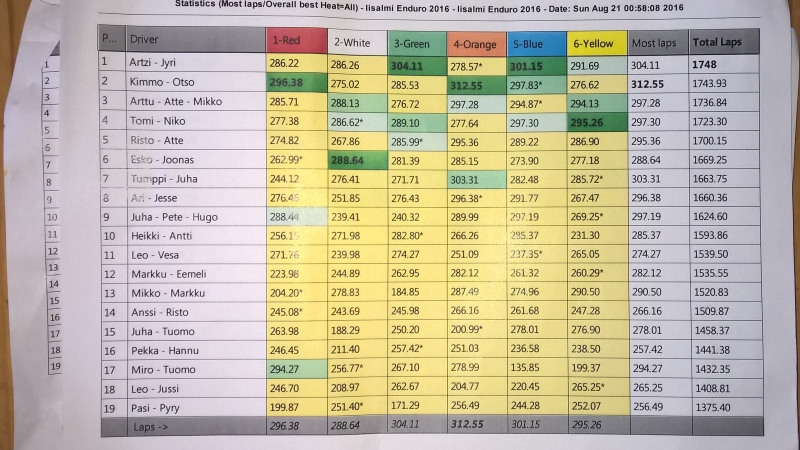 HUOM!!! MIRO tai YLY :arrow: Ekan kierroksen aikana tulostettiin jokaisen ajetun uran jälkeen sen hetkinen tilanne paperille, ne paperit on siellä ylhäällä pitkällä seinäpöydällä! Tuli mieleeni että niistä saa koostettua urakohtaiset ekasta puolikkaasta :!: :!: Joten toivon mukaan eivät ole vielä roskiksessa, jos saisin niistä ihan vaikka kännykuvat postiini, jokainen omana postina niin perille tulee