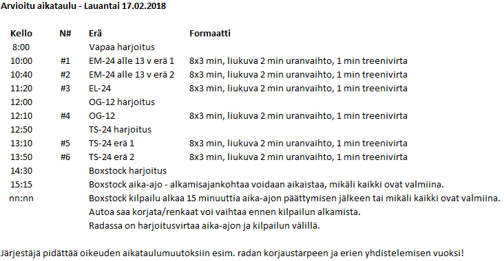 Varsinainen ilmoittautumisaika on umpeutunut, mutta mikäli kiinnostaa tulla ajamaan, otetaan erät täyteen. EM-24 ja TS-24 mahtuu 16 kuskia per luokka, EL-24 mahtuu 8 per luokka. Näissä luokissa on sen verran nuoria kuljettajia, ettei Round Robinin kanssa aleta sekoilemaan. OG-12:ssa ja Boxstockissa mukaan mahtuvat kaikki halukkaat, mutta näissä luokissa tehdään tarvittaessa Round Robin-eriä.