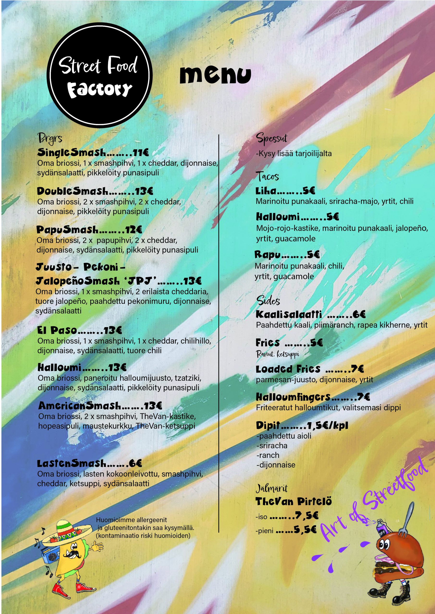 Kolmen vahvan kokemuksen omaavan kokin haave omasta yrityksestä konkretisoitui koronan ja lomautusten myötä; oli aika tehdä jotain uutta, ja alettiin luomaan yritystä. Street Food Factory  oy:n tarkoituksena on muuttaa käsitystä katuruuasta sekä luoda uutta ruokakulttuuria Kotkaan. Ihmisten kohtaamisen kautta he haluavat toteuttaa uusia makuelämyksiä erilaisten katuruokien kautta. The Vanin porukalla on alusta saakka ollut vahva luotto omaan visioon. He haluavat tuoda markkinoille jotain, missä yhdistyy katuruuan kepeys sekä kokemuksemme tuoma tietotaito. Tuotteisa nauttii sekä kulinaristi että vaatimattomampi herkkusuu – katuruoka on kaikille.The Vanin tiimi koostuu kokeista, joiden kokemus on karttunut laadukkaiden mestareiden opeissa ympäri Suomen. Näkemystä on niin fine diningista kuin yökerhoelämästäkin. Laadukkaan katuruuan tarjoaminen pilke silmäkulmassa kiteyttää yrityksemme päämäärän. Tuotteemme tehdään käsityönä puhtaista ja laadukkaista raaka-aineista; keittiöllämme leivotaan muun muassa burgereidemme briossisämpylät itse. Uusia ideoita syntyy jatkuvasti humoristisen työotteen ja tuotekehityksen vuoropuhelun tuotteena.